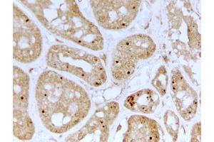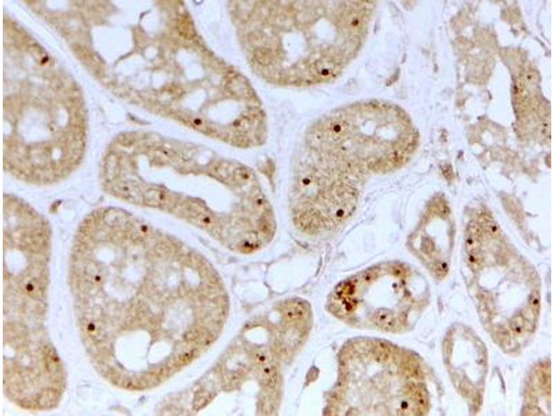 Immunohistochemistry: In paraffin embedded Human Kidney shows strong nucleolar staining in convoluted tubules. Recommended concentration, 2-4 μg/mL.
