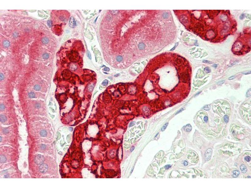 Immunohistochemistry: Paraffin embedded Human Kidney. Recommended concentration: 5-7 μg/mL.