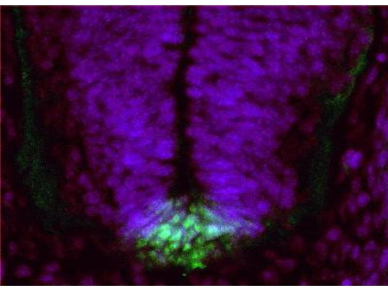 Immunohistochemistry: Frozen sections of Mouse embryo E13.5 shows staining of the floor plate of the developing spinal cord. Recommended concentration, 1-3 μg/mL.