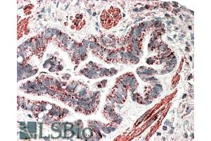 Immunohistochemistry: In paraffin embedded Human Lung shows staining of smooth muscle cells, vasculature and apical secretory granules in the epithelium of the bronchiole. Recommended concentration: 5-10 μg/mL.