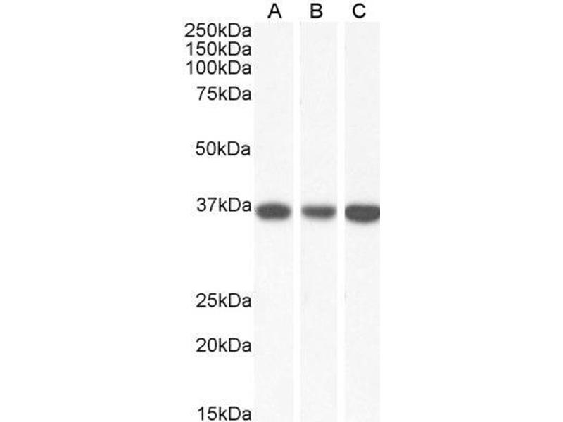 Western Blot: Approx 36-37 kDa band observed in lysates of cell lines HeLa, HepG2 and K562, and approx 35 kDa band observed in Human Heart and Liver lysates (calculated MW of 35.5 kDa according to NP_005909.2). Recommended concentration: 0.01-0.03 μg/mL.