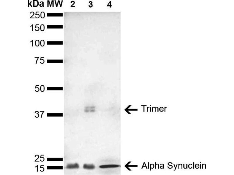 - Expressed principally in brain but is also expressed in low concentrations in all tissues examined except in liver. Concentrated in presynaptic nerve terminals.,Binds multiple linear epitopes within human ASYN: 21-70 aa, 61-90 aa, and 101-140 aa, determined using DB & ELISA with corresponding peptides. Detects ~14 kDa band corr to ASYN. ~40 kDa is a trimer.