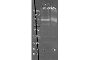 Application Note: Anti-Lactoperoxidase Peroxidase Conjugated Antibody has been tested by dot blot and western blot and is suitable to be assayed against 1.0 μg of Lactoperoxidase [Bovine Milk] in a standard capture ELISA using ABTS (2,2'-azino-bis-[3-ethylbenthiazoline-6-sulfonic acid]) code # ABTS-100 as a substrate for 30 minutes at room temperature. A working dilution of 1:2,000 to 1:10,000 of the reconstitution concentration is suggested for Anti-Lactoperoxidase Antibody.