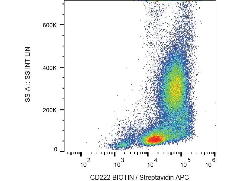 Insulin like growth factor 2 receptorprovided,CD222 (CIMPR, cation-independent mannose 6-phosphate receptor, IGF2 receptor) is a ubiquitously expressed 250 kDa transmembrane protein. No more than 10 % of CD222 is present on the cell surface where it serves as a multifunctional receptor. Intracellular (major) fraction of CD222 is involved in transport of newly synthesized lysosomal enzymes modified by mannose 6-phosphate from Golgi apparatus to lysosomes. The cell surface CD222 binds and internalizes exogeneous mannose 6-phosphate-containing ligands. Importantly, CD222 is crutial for internalization and degradation of insulin-like growth factor 2, thus controling cell growth. CD222 also complexes CD87 (urokinase-type plasminogen-activator receptor), plasminogen and latent TGF-beta, last but not least CD222 serves as a receptor for heparanase and even for Listeria.,IGF2R, MPR1, CIMPR, MPR300, M6P-R