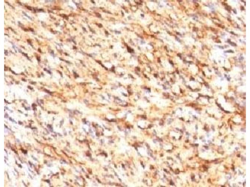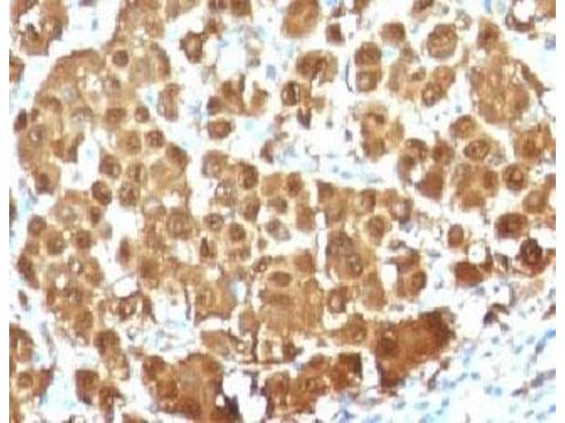 - S100 belongs to the family of calcium binding proteins. S100 alpha and S100 beta proteins are two members of the S100 family. S100A is composed of an alpha and a beta chain whereas S100B is composed of two beta chains. This antibody is specific against an epitope located on the beta-chain (i.e. in S100A and S100B) but not on the alpha-chain of S100 (i.e. in S100A and S100A0). This antibody can be used to localize S100A and S100B in various tissue sections. S100 protein has been found in normal melanocytes, Langerhans cells, histiocytes, chondrocytes, lipocytes, skeletal and cardiac muscle, Schwann cells, epithelial and myoepithelial cells of the breast, salivary and sweat glands, as well as in glial cells. Neoplasms derived from these cells also express S100 protein, albeit non-uniformly. A large number of well-differentiated tumors of the salivary gland, adipose and cartilaginous tissue, and Schwann cell-derived tumors express S100 protein. Almost all malignant melanomas and cases of histiocytosis X are positive for S100 protein.