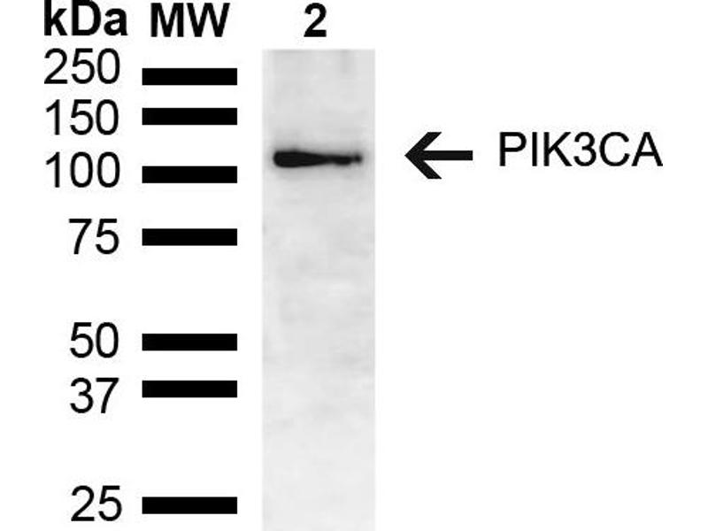 A 1:1000 dilution of ABIN5651073 was sufficient for detection of PIK3CA in 15 μg of mouse brain cell lysates by ECL immunoblot analysis using goat anti-rabbit IgG:HRP as the secondary antibody.