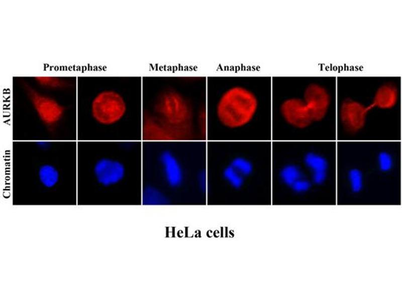 The aurora family (A, B and C) are serine threonine kinases and key regulators of chromosome segregation during mitosis. Aurora kinase B is a chromosomal passenger protein that regulates chromosome segregation and cytokinesis. Aurora kinase B is associated with the level of genetic instability within tumours and patient survival. It is strongly expressed in exponentially proliferating bronchial epithelial cells in culture and that this expression is markedly reduced in confluent cells. It is also shown that almost all tumours show higher levels of Aurora kinase B expression than their matched normal lung tissues, which could therefore simply be a consequence of a higher proliferative index, or be typical of the progenitor cell and atypical of the bulk of normal lung cells.Synonyms: AIK2, AIM1, ARK2, AURKB, Aurora- and Ipl1-like midbody-associated protein 1, Aurora-B, Aurora/IPL1-related kinase 2, STK-1, STK12, Serine/threonine-protein kinase 12
