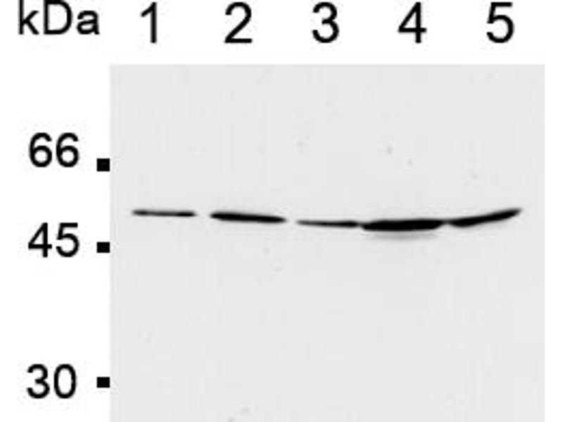 The Rat Monoclonal anti-POLD2 antibody (Clone 7B4) (ABIN567777) specifically detects POLD2 in WB.