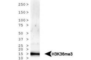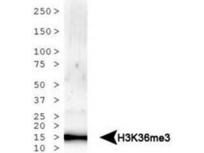 Immunogen: Histone H3 [Trimethyl Lys36] affinity purified antibody was prepared from whole rabbit serum produced by repeated immunizations with a synthetic trimethylated peptide surrounding Lysine 36 of human Histone H3.2.