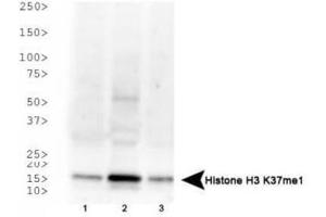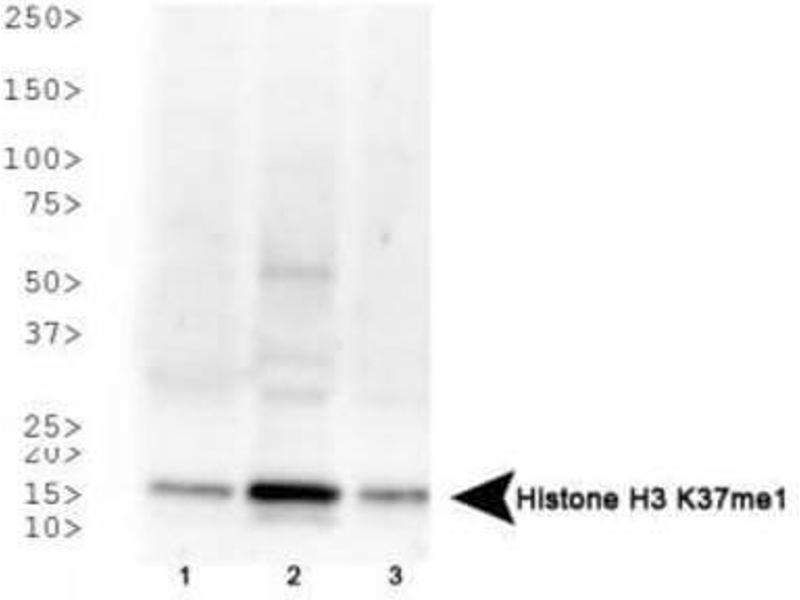 Immunogen: Histone H3 [Monomethyl Lys37] affinity purified antibody was prepared from whole rabbit serum produced by repeated immunizations with a synthetic methylated peptide surrounding Lysine 37 of human Histone H3.