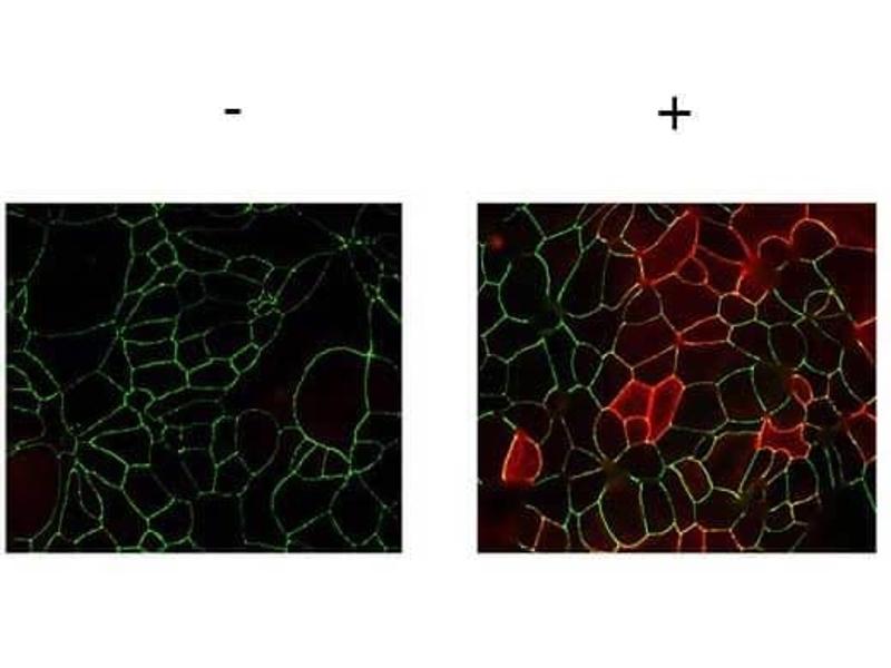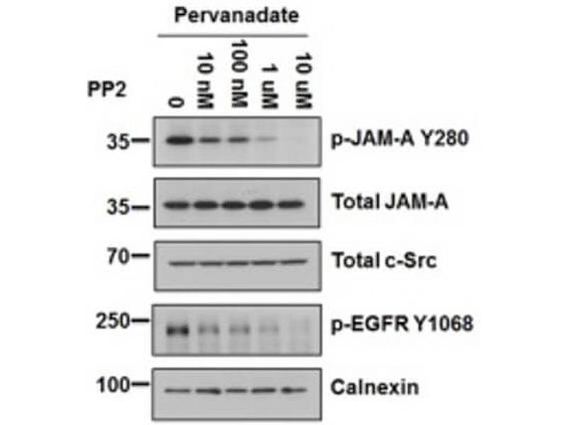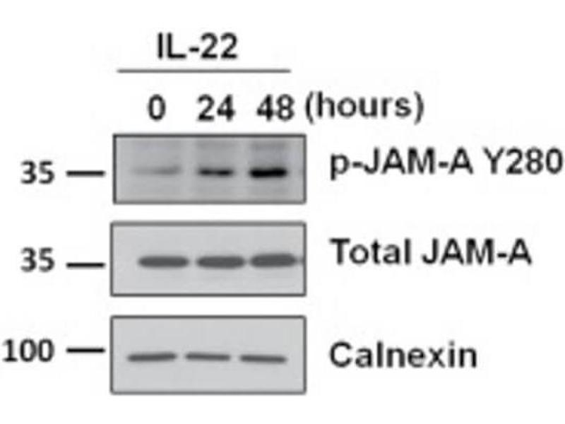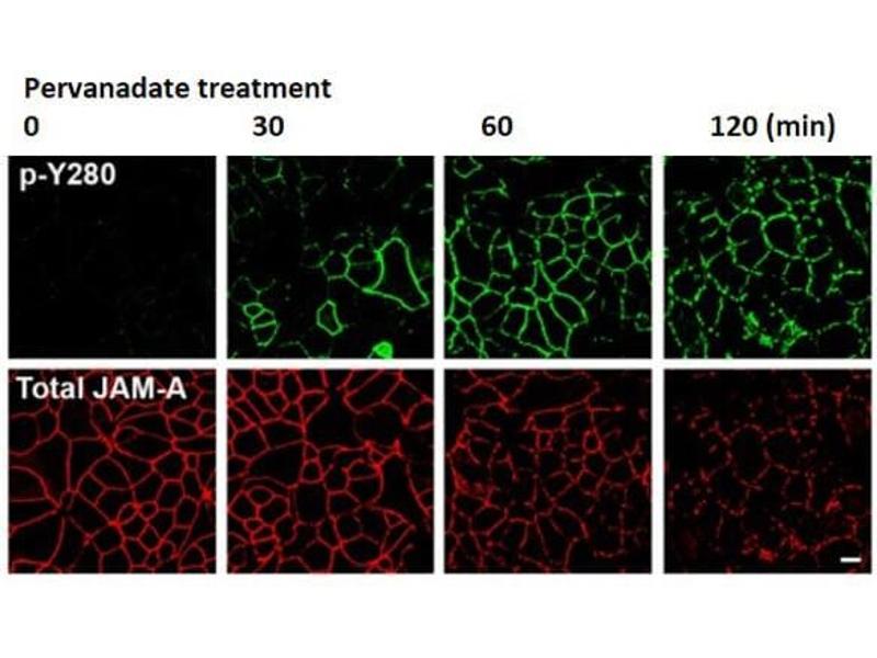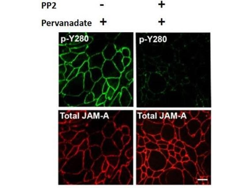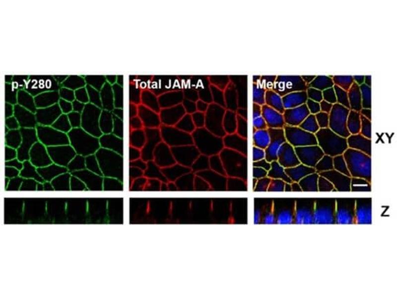 Immunogen: Affinity purified Anti-JAM A pY280 antibody was prepared from whole rabbit serum produced by repeated immunizations with a synthetic peptide corresponding to the c-term and phosphorylated at the tyrosine 280 position of Human JAM A protein.