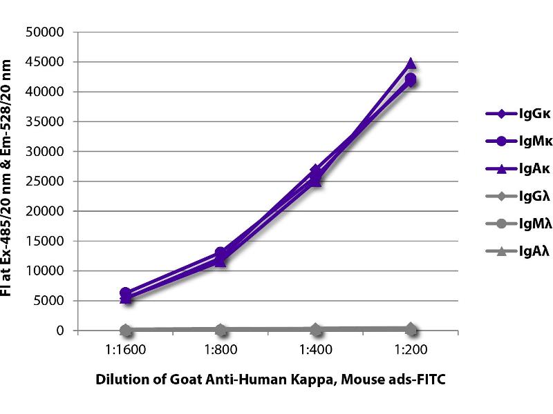 Working Dilutions: ELISA AP conjugate 1:2,000 - 1:4,000 HRP conjugate 1:4,000 - 1:8,000 BIOT conjugate 1:5,000 - 1:20,000 FLISA FITC, TRITC, and TXRD conjugates 1:100 - 1:400 PE conjugate 1 g/mL Flow Cytometry Purified (UNLB) antibody 1 g/106 cells FITC and BIOT conjugates 1 g/106 cells PE conjugate 0.1 g/106 cells For flow cytometry, the suggested use of these reagents is in a final volume of 100 L