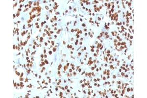 1. The prediluted format is supplied in a dropper bottle and is optimized for use in IHC. After epitope retrieval step (if required), drip mAb solution onto the tissue section and incubate at RT for 30 min.\. Immunohistochemistry (FFPE): 0.5-1 μg/mL for 30 min at RT,Prediluted IHC only format: incubate for 30 min at RT (1)