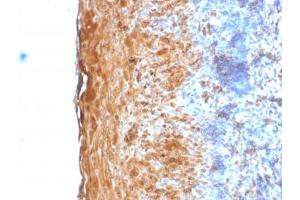 1. Staining of formalin-fixed tissues is enhanced by digestion with Trypsin or Protease XXV at 1 mg/mL PBS for 5 min at 37oC. Enzyme digestion is more effective than Citrate buffer based epitope unmasking.