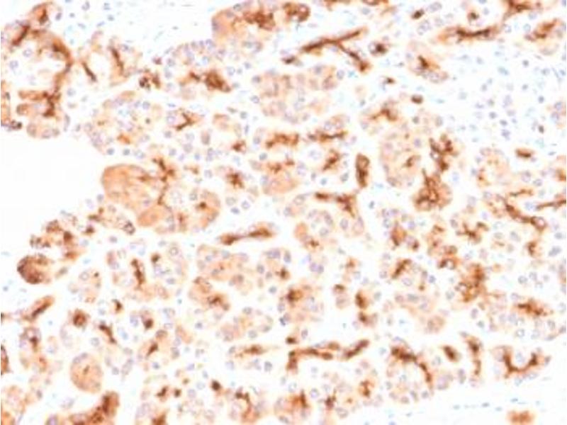 1. The prediluted format is supplied in a dropper bottle and is optimized for use in IHC. After epitope retrieval step (if required), drip mAb solution onto the tissue section and incubate at RT for 30 min.\. Immunohistochemistry (FFPE): 0.5-1 μg/mL for 30 min at RT,Prediluted IHC only format: incubate for 30 min at RT (1) -