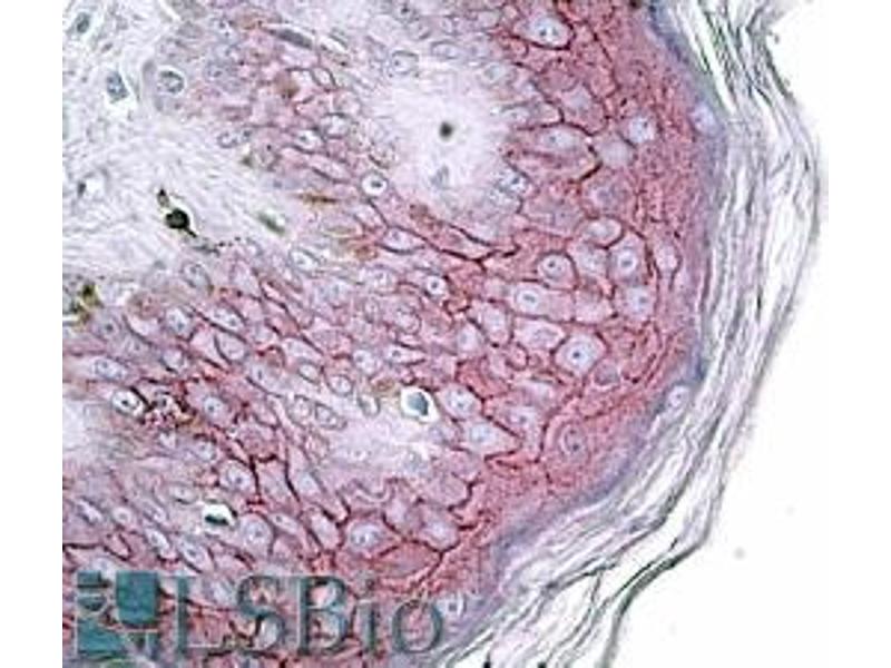 Immunohistochemistry: In paraffin embedded Human Skin showsstaining of the cellular membranes of keratinocytes. Recommended concentration, 4-6 μg/mL.
