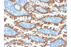 Cytokeratin 8 (CK8) belongs to the type II (or B or basic) subfamily of high molecular weight cytokeratins and exists in combination with cytokeratin 18 (CK18). Cytokeratin 8 is primarily found in the non-squamous epithelia and is present in majority of adenocarcinomas and ductal carcinomas. It is absent in squamous cell carcinomas. Hepatocellular carcinomas are defined by the use of antibody that recognizes only cytokeratin 8 and 18. Cytokeratin 8 exists on several types of normal and neoplastic epithelia, including many ductal and glandular epithelia such as colon, stomach, small intestine, trachea, and esophagus as well as in transitional epithelium.