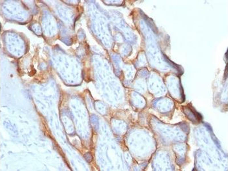 - This antibody reacts with a protein of 22 kDa, identified as beta subunit of HCG. It does not cross react with the alpha subunit. HCG is a glycoprotein which is secreted in large quantities by normal trophoblasts. It is present only in trace amounts in non-pregnant urine and sera but rises sharply during pregnancy. HCG is composed of two non-identical, non-covalently linked polypeptide chains designated as the alpha and beta subunits. The alpha subunit is identical to that of thyroid stimulating hormone (TSH), follicle stimulating hormone (FSH), and luteinizing hormone (LH). HCG-beta antibody detects cells and tumors of trophoblastic origin such as choriocarcinoma. Large cell carcinoma and adenocarcinoma of the lung demonstrate antibody positivity in 90 % and 60 % of cases respectively, 20 % of lung squamous cell carcinomas are positive. HCG expression by non-trophoblastic tumors may indicate aggressive behavior.