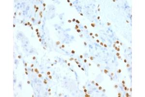1. The prediluted format is supplied in a dropper bottle and is optimized for use in IHC. After epitope retrieval step (if required), drip mAb solution onto the tissue section and incubate at RT for 30 min.\. Immunohistochemistry (FFPE): 0.5-1 μg/mL for 30 min at RT,Prediluted IHC only format: incubate for 30 min at RT (1) -