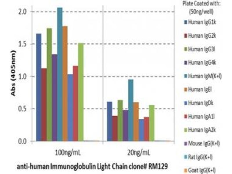 - This antibody reacts to both kappa and lambda light chain of human immunoglobulins. It does not react to monkey (Cyno or Rhesus) IgG, mouse IgG, rat IgG, or goat IgG.