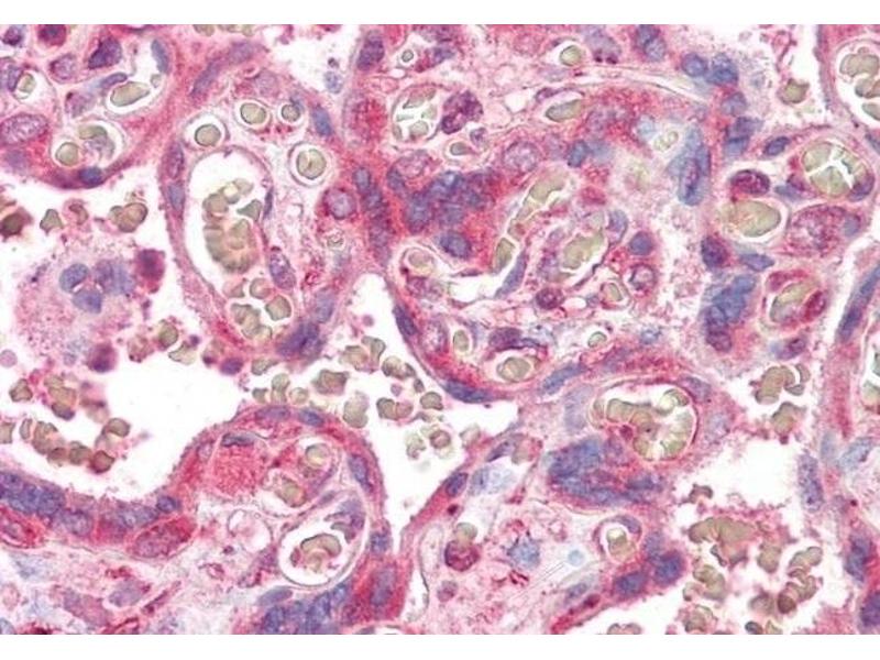 Immunohistochemistry: Paraffin embedded Human Placenta. Recommended concentration: 3.75 μg/mL. This product has been successfully used in IHC on Human: Frese S et al, PLoS One. 2015 Jul 8,10(7). PMID: 26154387.
