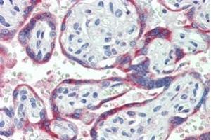 Immunohistochemistry: In paraffin embedded Human Placenta shows staining of syncytiotrophoblasts. Recommended concentration, 1-2 μg/mL.