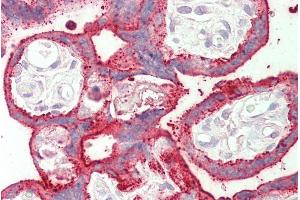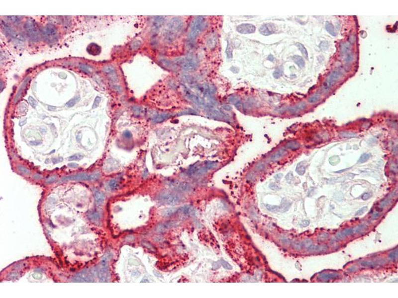 Immunohistochemistry: Paraffin embedded Human Placenta. Recommended concentration: 5 μg/mL.