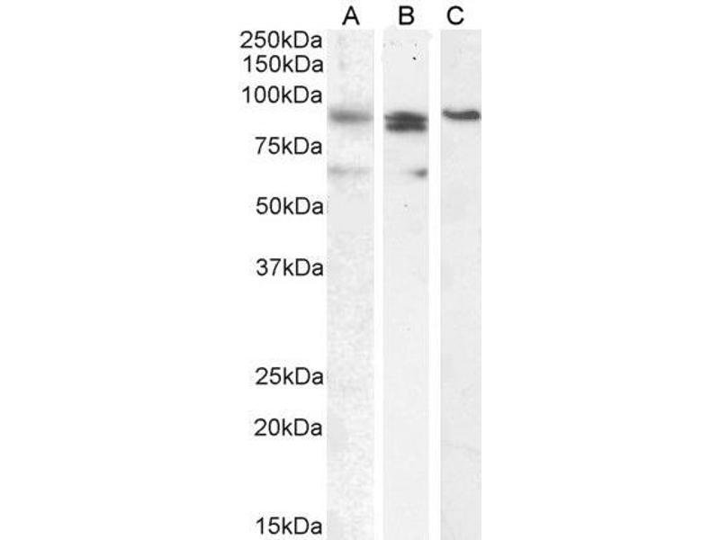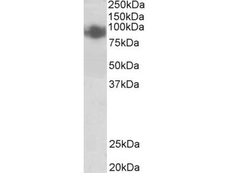 Western Blot: Approx 90 kDa band observed in lysates of cell lines A431 and Nuclear K562, and approx. 100 kDa in lysates of cell line K562. An additional faint band of approx 70 kDa was also seen in some A431 and K562 lysates (calculated MW of 91.8 kDa accor