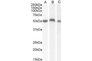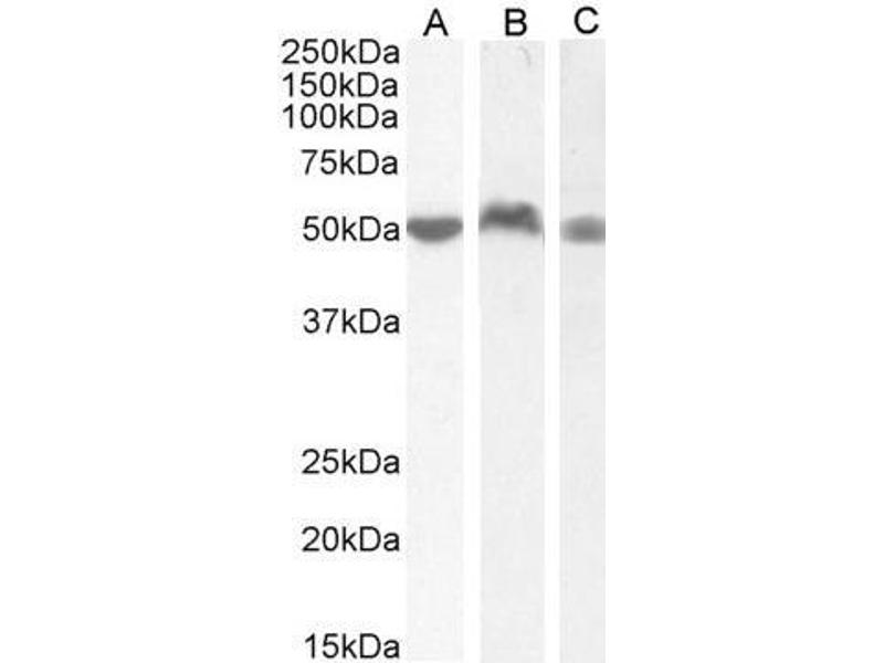 Western Blot: Approx 50 kDa band observed in Human Peripheral Blood Mononucleocytes, (PBMs) and Tonsil lysates and in lysates of cell line Daudi, and approx. 50-55 kDa in Human Tonsil and Mouse Spleen lysates (calculated MW of 37.2 kDa according to Human NP
