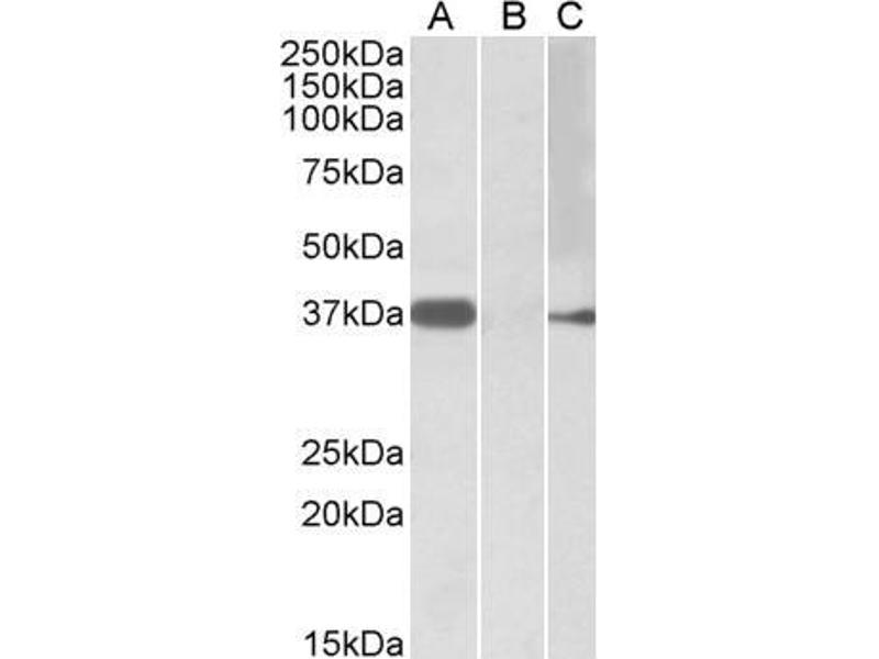 Western Blot: In transfected HEK293 transiently expressing full-length Human MYF6 (myc and DYKDDDDK tagged), a band of approx. 37 kDa was observed. No bands were observed in mock-transfected HEK293 and the same band was observed using anti-myc tag antibod
