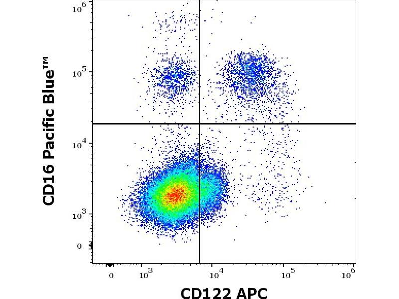 Interleukin 2 receptor subunit beta,CD122 (IL-2/IL-15R beta) constitutes together with CD132 (common gamma chain) and with CD25 (IL-2/IL15R alpha) the intermediate (CD122+CD132) and the high affinity (CD122+CD132+CD25) IL-2 and IL-15 receptor complex. CD122 is expressed on NK cells and lymphocytes, but at low level, unless the cell is activated. The cytoplasmic part of CD122 binds to Src-family and Jak-family kinases. The biological effect of CD122 ligation depends on whether IL-2 or IL-15 is bound to the receptor complex.,IL2RB, IL15RB, P70-75