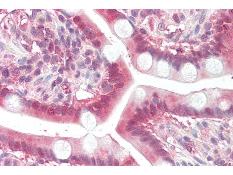 Immunohistochemistry: Paraffin embedded Human Small Intestine. Recommended concentration: 3.75 μg/mL.