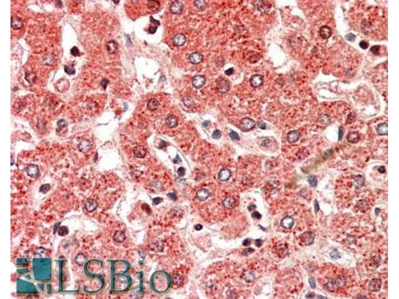 Immunohistochemistry: In paraffin embedded Human Liver shows textured staining of the cytoplasm consistent with mitochondria. Recommended concentration, 5-10 μg/mL.
