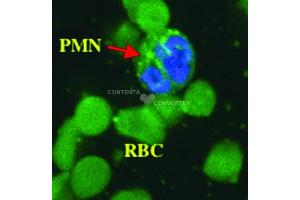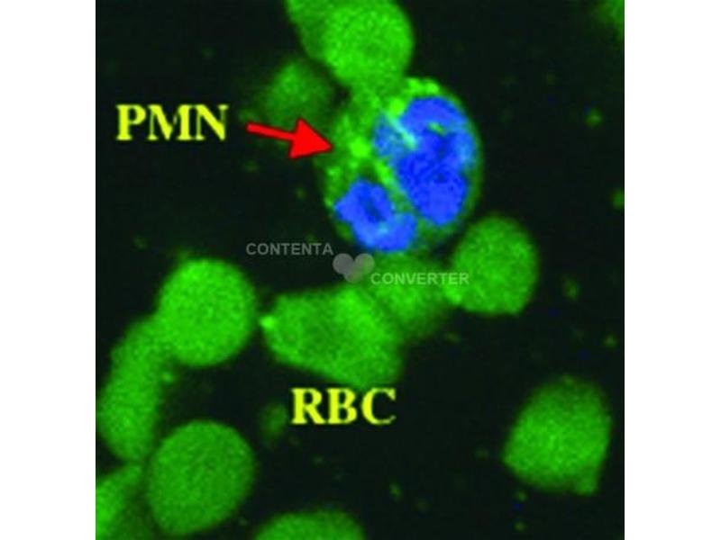 Western blotting, 1:1,000 AbX™ Anti-Cysteine Mouse Monoclonal ImmuNOhIstOChemIstry Porcine peripheral red blood cells were paraffin embedded and sectioned. 4 μm sections were de-paraffinized and rehydrated. Sections were incubated with or without additional thiol compounds and anti-cysteine anti- body for 2 hours at room temperature. Antibody concentration was 3 μg/mL. Sections were blocked pre- and post antibody treatements with 1 % BSA in PBS. Development was with a goat anti-mouse IgG antibody labeled with Alexa™ 488. RBC + Anti-Cysteine RBC + Anti-Cysteine + 20 mM Cysteine Cysteine addition was carried out at 20 mM in 1 % BSA in PBS and added with the monoclonal anti-cysteine antibody at 3 μg/mL for 1 hour at room temperature. With polymorphonuclear neutrophils addition of 20 mM cytseine reduced or eliminated the goat anti-mouse IgG-Alexa 488 signal PMN + Anti-Cysteine PMN + Anti-Cysteine + 20 mM Cysteine Nuclear staining was carried out with TOPRO at 1:500 dilution in PBS.