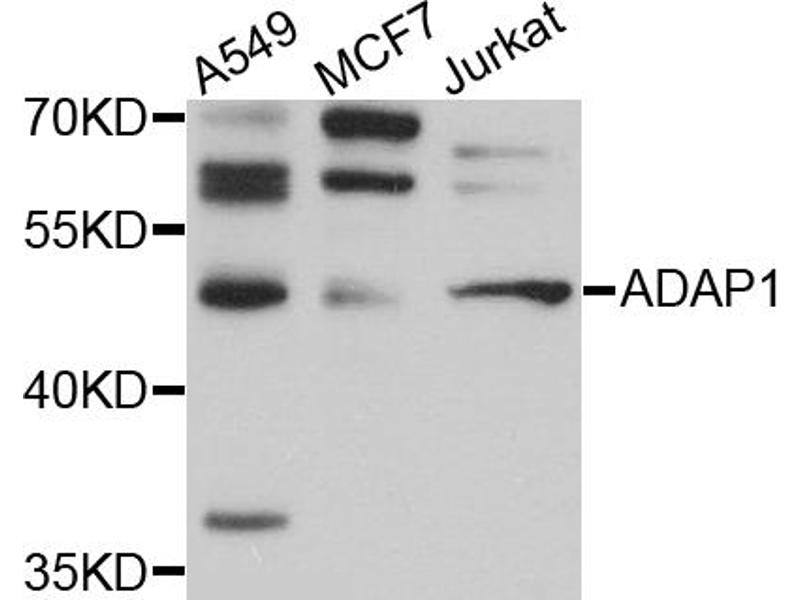 This Rabbit Polyclonal antibody specifically detects ADAP1 in WB. It exhibits reactivity toward Human, Mouse and Rat.