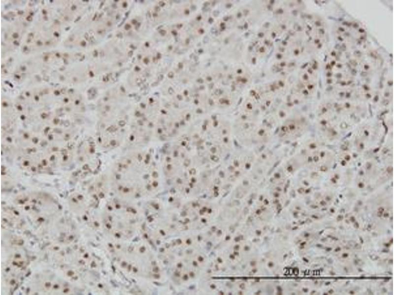 Usage: Immunohistochemistry: Formalin-fixed paraffin-embedded sections. Sandwich ELISA: Recombinant protein. Western Blot: Cell lysate, Transfected lysate, Recombinant protein. -