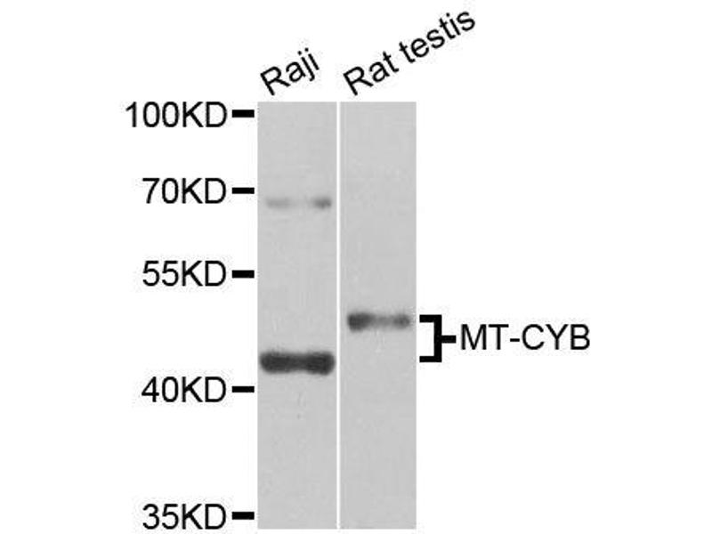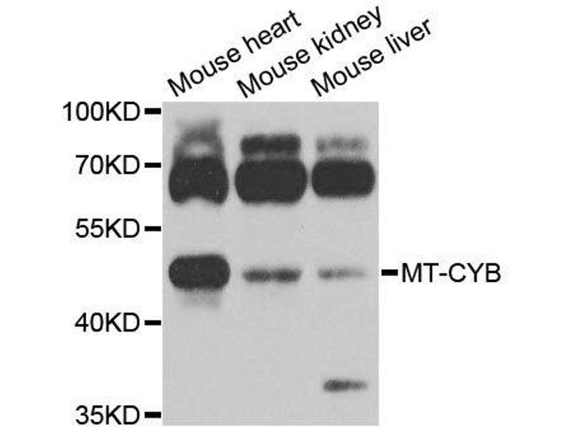 This Rabbit Polyclonal antibody specifically detects Cytochrome b in WB. It exhibits reactivity toward Human, Mouse and Rat.