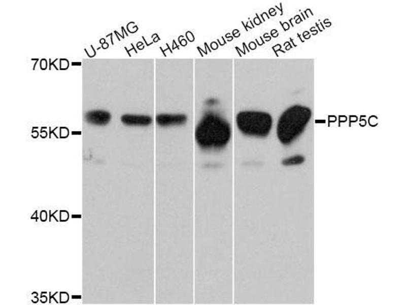 The Rabbit Polyclonal anti-PP5 antibody is suitable to detect PP5 in samples from Human, Rat and Mouse. It has been validated for WB.