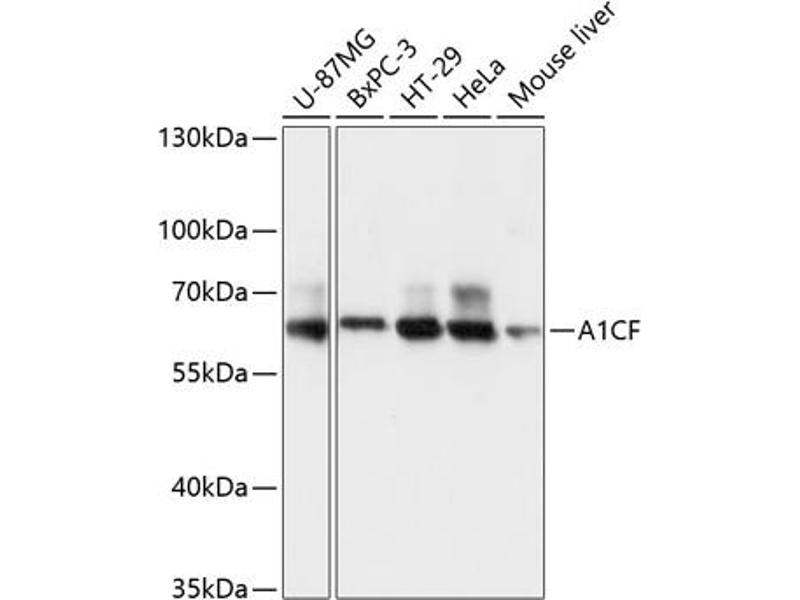 - Mammalian apolipoprotein B mRNA undergoes site-specific C to U deamination, which is mediated by a multi-component enzyme complex containing a minimal core composed of APOBEC-1 and a complementation factor encoded by this gene. The gene product has three non-identical RNA recognition motifs and belongs to the hnRNP R family of RNA-binding proteins. It has been proposed that this complementation factor functions as an RNA-binding subunit and docks APOBEC-1 to deaminate the upstream cytidine. Studies suggest that the protein may also be involved in other RNA editing or RNA processing events. Several transcript variants encoding a few different isoforms have been found for this gene.,A1CF,ACF,ACF64,ACF65,APOBEC1CF,ASP,Epigenetics & Nuclear Signaling,A1CF