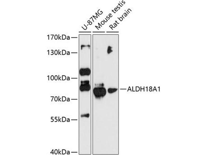 This gene is a member of the aldehyde dehydrogenase family and encodes a bifunctional ATP- and NADPH-dependent mitochondrial enzyme with both gamma-glutamyl kinase and gamma-glutamyl phosphate reductase activities. The encoded protein catalyzes the reduction of glutamate to delta1-pyrroline-5-carboxylate, a critical step in the de novo biosynthesis of proline, ornithine and arginine. Mutations in this gene lead to hyperammonemia, hypoornithinemia, hypocitrullinemia, hypoargininemia and hypoprolinemia and may be associated with neurodegeneration, cataracts and connective tissue diseases. Alternatively spliced transcript variants, encoding different isoforms, have been described for this gene.,ALDH18A1,ADCL3,ARCL3A,GSAS,P5CS,PYCS,SPG9,SPG9A,SPG9B,Epigenetics & Nuclear Signaling,RNA Binding,Cancer,Signal Transduction,Endocrine & Metabolism,Amino acid metabolism,ALDH18A1