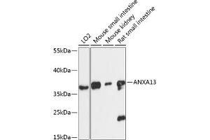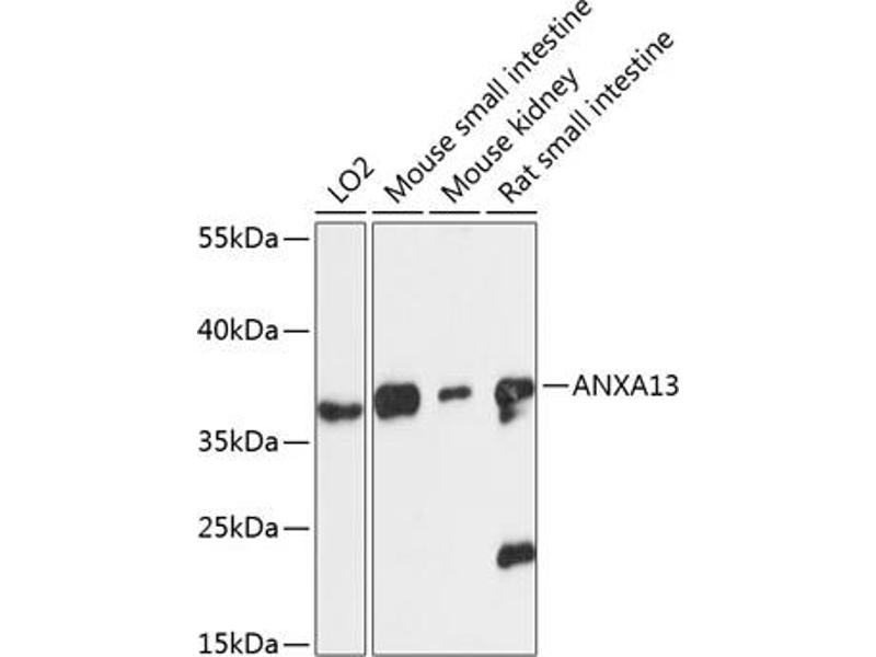 This gene encodes a member of the annexin family. Members of this calcium-dependent phospholipid-binding protein family play a role in the regulation of cellular growth and in signal transduction pathways. The specific function of this gene has not yet been determined, however, it is associated with the plasma membrane of undifferentiated, proliferating endothelial cells and differentiated villus enterocytes. Alternatively spliced transcript variants encoding different isoforms have been identified.,ANXA13,ANX13,ISA,Signal Transduction,Cell Biology & Developmental Biology,Cell Adhesion,Annexins,Cytoskeleton,ANXA13