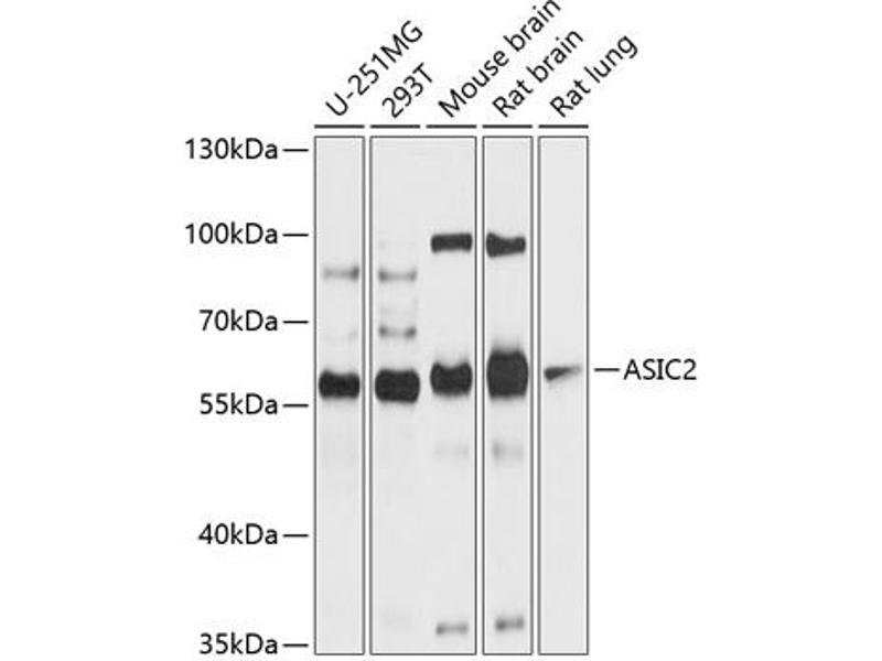 This gene encodes a member of the degenerin/epithelial sodium channel (DEG/ENaC) superfamily. The members of this family are amiloride-sensitive sodium channels that contain intracellular N and C termini, 2 hydrophobic transmembrane regions, and a large extracellular loop, which has many cysteine residues with conserved spacing. The member encoded by this gene may play a role in neurotransmission. In addition, a heteromeric association between this member and acid-sensing (proton-gated) ion channel 3 has been observed to co-assemble into proton-gated channels sensitive to gadolinium. Alternative splicing has been observed at this locus and two variants, encoding distinct isoforms, have been identified.,ASIC2,ACCN,ACCN1,ASIC2a,BNC1,BNaC1,MDEG,hBNaC1,Cell Biology & Developmental Biology,Apoptosis,Neuroscience,ASIC2