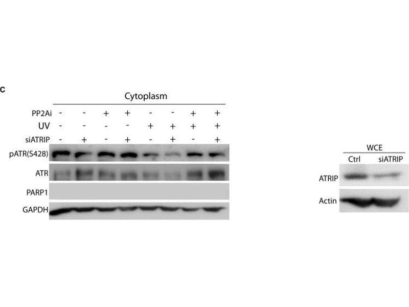 - This gene encodes an essential component of the DNA damage checkpoint. The encoded protein binds to single-stranded DNA coated with replication protein A. The protein also interacts with the ataxia telangiectasia and Rad3 related protein kinase, resulting in its accumulation at intranuclear foci induced by DNA damage. Multiple transcript variants encoding different isoforms have been found for this gene.,ATRIP,Epigenetics & Nuclear Signaling,DNA Damage & Repair,ATRIP