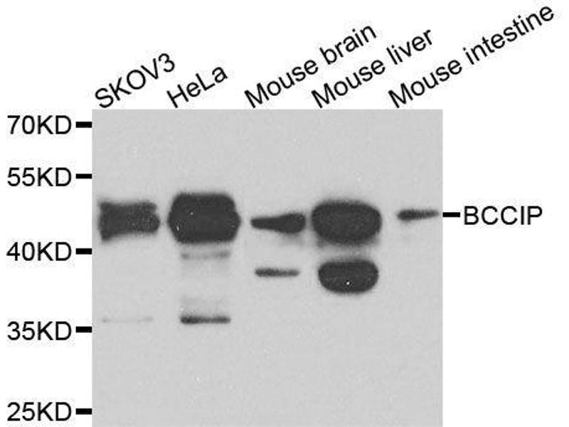 - This gene product was isolated on the basis of its interaction with BRCA2 and p21 proteins. It is an evolutionarily conserved nuclear protein with multiple interacting domains. The N-terminal half shares moderate homology with regions of calmodulin and M-calpain, suggesting that it may also bind calcium. Functional studies indicate that this protein may be an important cofactor for BRCA2 in tumor suppression, and a modulator of CDK2 kinase activity via p21. This protein has also been implicated in the regulation of BRCA2 and RAD51 nuclear focus formation, double-strand break-induced homologous recombination, and cell cycle progression. Multiple transcript variants encoding different isoforms have been described for this gene.,BCCIP,TOK-1,TOK1,Epigenetics & Nuclear Signaling,DNA Damage & Repair,RNA Binding,Cancer,Tumor suppressors,p53 pathway,Cell Biology & Developmental Biology,Cell Cycle,Cell cycle inhibitors,Immunology & Inflammation,Cytokines,BCCIP