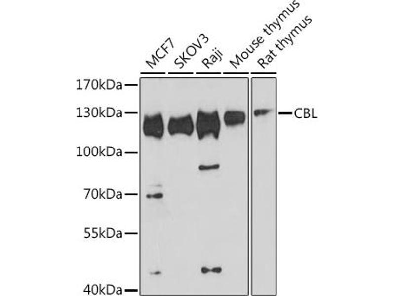 This gene is a proto-oncogene that encodes a RING finger E3 ubiquitin ligase. The encoded protein is one of the enzymes required for targeting substrates for degradation by the proteasome. This protein mediates the transfer of ubiquitin from ubiquitin conjugating enzymes (E2) to specific substrates. This protein also contains an N-terminal phosphotyrosine binding domain that allows it to interact with numerous tyrosine-phosphorylated substrates and target them for proteasome degradation. As such it functions as a negative regulator of many signal transduction pathways. This gene has been found to be mutated or translocated in many cancers including acute myeloid leukaemia, and expansion of CGG repeats in the 5' UTR has been associated with Jacobsen syndrome. Mutations in this gene are also the cause of Noonan syndrome-like disorder.,C-CBL,CBL2,FRA11B,NSLL,RNF55,CBL,c-Cbl,Epigenetics & Nuclear Signaling,Nuclear Receptor Signaling,Nuclear hormone receptors,Cancer,Signal Transduction,ErbB-HER Signaling Pathway,Cell Biology & Developmental Biology,Ubiquitin,Ubiquitin-Proteasome Signaling Pathway,Endocrine & Metabolism,Insulin Receptor Signaling Pathway,Immunology & Inflammation,B Cell Receptor Signaling Pathway,T Cell Receptor Signaling Pathway,CBL