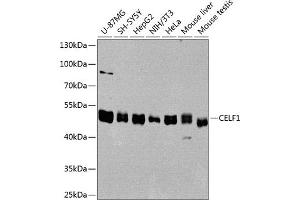 - Members of the CELF/BRUNOL protein family contain two N-terminal RNA recognition motif (RRM) domains, one C-terminal RRM domain, and a divergent segment of 160-230 aa between the second and third RRM domains. Members of this protein family regulate pre-mRNA alternative splicing and may also be involved in mRNA editing, and translation. This gene may play a role in myotonic dystrophy type 1 (DM1) via interactions with the dystrophia myotonica-protein kinase (DMPK) gene. Alternative splicing results in multiple transcript variants encoding different isoforms.,CELF1,BRUNOL2,CUG-BP,CUGBP,CUGBP1,EDEN-BP,NAB50,NAPOR,hNab50,Epigenetics & Nuclear Signaling,RNA Binding,Neuroscience,Neurodegenerative Diseases,CELF1