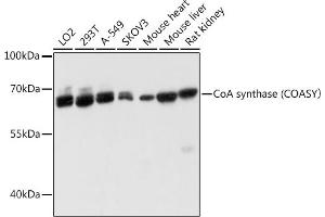 Coenzyme A (CoA) functions as a carrier of acetyl and acyl groups in cells and thus plays an important role in numerous synthetic and degradative metabolic pathways in all organisms. In eukaryotes, CoA and its derivatives are also involved in membrane trafficking and signal transduction. This gene encodes the bifunctional protein coenzyme A synthase (CoAsy) which carries out the last two steps in the biosynthesis of CoA from pantothenic acid (vitamin B5). The phosphopantetheine adenylyltransferase domain of this bifunctional protein catalyzes the conversion of 4'-phosphopantetheine into dephospho-coenzyme A (dpCoA) while its dephospho-CoA kinase domain completes the final step by phosphorylating dpCoA to form CoA. Mutations in this gene are associated with neurodegeneration with brain iron accumulation (NBIA). Alternative splicing results in multiple isoforms.,COASY,DPCK,NBIA6,NBP,PPAT,UKR1,pOV-2,Cancer,Signal Transduction,Endocrine & Metabolism,Mitochondrial metabolism,Mitochondrial markers,COASY