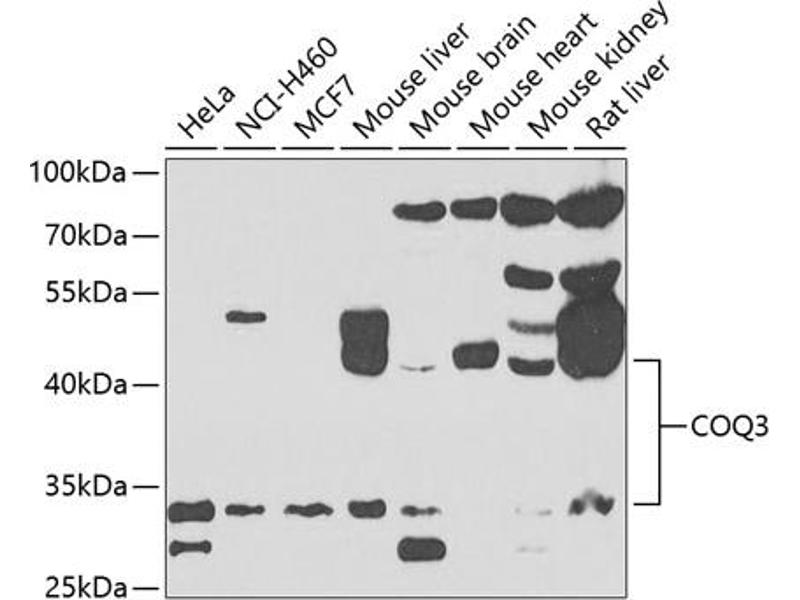 Ubiquinone, also known as coenzyme Q, or Q, is a critical component of the electron transport pathways of both eukaryotes and prokaryotes (Jonassen and Clarke, 2000 [PubMed 10777520]). This lipid consists of a hydrophobic isoprenoid tail and a quinone head group. The tail varies in length depending on the organism, but its purpose is to anchor coenzyme Q to the membrane. The quinone head group is responsible for the activity of coenzyme Q in the respiratory chain. The S. cerevisiae COQ3 gene encodes an O-methyltransferase required for 2 steps in the biosynthetic pathway of coenzyme Q. This enzyme methylates an early coenzyme Q intermediate, 3,4-dihydroxy-5-polyprenylbenzoic acid, as well as the final intermediate in the pathway, converting demethyl-ubiquinone to coenzyme Q. The COQ3 gene product is also capable of methylating the distinct prokaryotic early intermediate 2-hydroxy-6-polyprenyl phenol.[supplied by OMIM, Mar 2008],COQ3,DHHBMT,DHHBMTASE,UG0215E05,bA9819.1,coenzyme Q3,Epigenetics & Nuclear Signaling,Cancer,Signal Transduction,Endocrine & Metabolism,Mitochondrial metabolism,Mitochondrial markers,COQ3