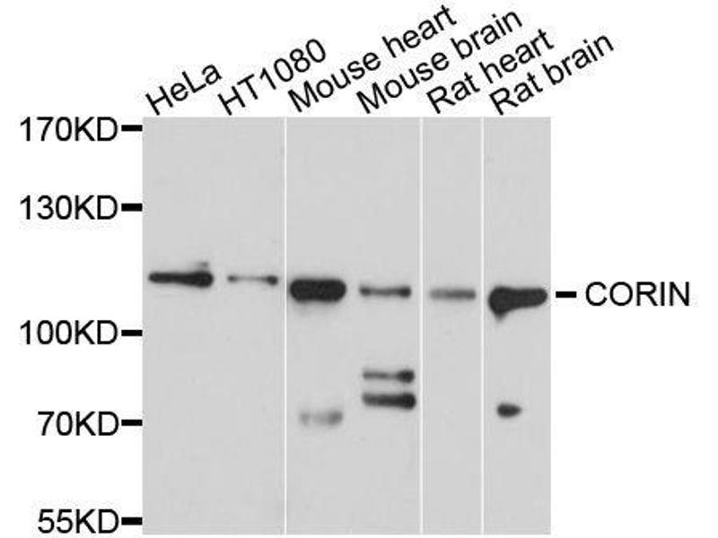 - This gene encodes a member of the type II transmembrane serine protease class of the trypsin superfamily. Members of this family are composed of multiple structurally distinct domains. The encoded protein converts pro-atrial natriuretic peptide to biologically active atrial natriuretic peptide, a cardiac hormone that regulates blood volume and pressure. This protein may also function as a pro-brain-type natriuretic peptide convertase. Multiple alternatively spliced transcript variants encoding different isoforms have been found for this gene.,CORIN,ATC2,CRN,Lrp4,PEE5,TMPRSS10,corin,Cell Biology & Developmental Biology,Ubiquitin,Cardiovascular,Blood,Blood Pressure regulation,CORIN