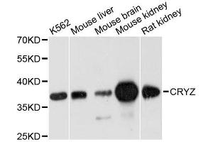 - Crystallins are separated into two classes: taxon-specific, or enzyme, and ubiquitous. The latter class constitutes the major proteins of vertebrate eye lens and maintains the transparency and refractive index of the lens. The former class is also called phylogenetically-restricted crystallins. This gene encodes a taxon-specific crystallin protein which has NADPH-dependent quinone reductase activity distinct from other known quinone reductases. It lacks alcohol dehydrogenase activity although by similarity it is considered a member of the zinc-containing alcohol dehydrogenase family. Unlike other mammalian species, in humans, lens expression is low. Alternatively spliced transcript variants encoding different isoforms have been found for this gene. One pseudogene is known to exist.,CRYZ,Epigenetics & Nuclear Signaling,Cancer,Signal Transduction,Endocrine & Metabolism,Nucleotide metabolism,Drug metabolism,Neuroscience,CRYZ
